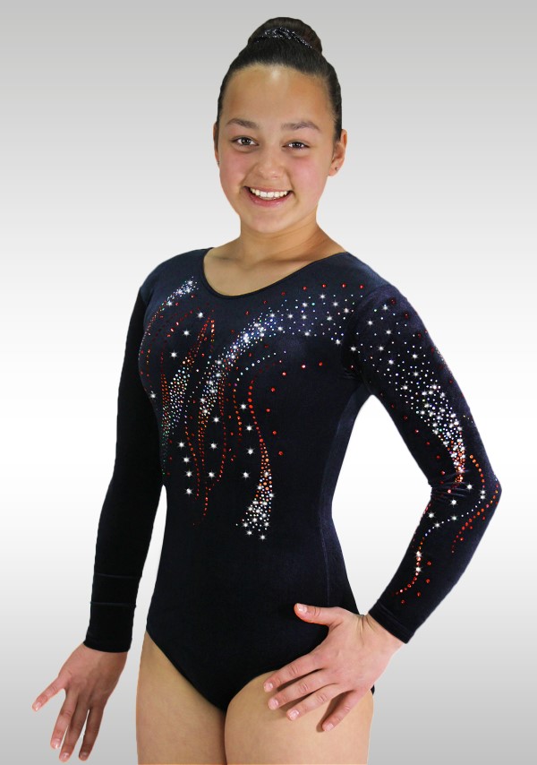 Leotard V706 long sleeves in black velvet with a superb decoration of red and silver glitters This Leotard in black velvet has a beatiful design of red and silver glitters on the front. For an assorted legging, choose your model and color in the category 'smooth velvet'