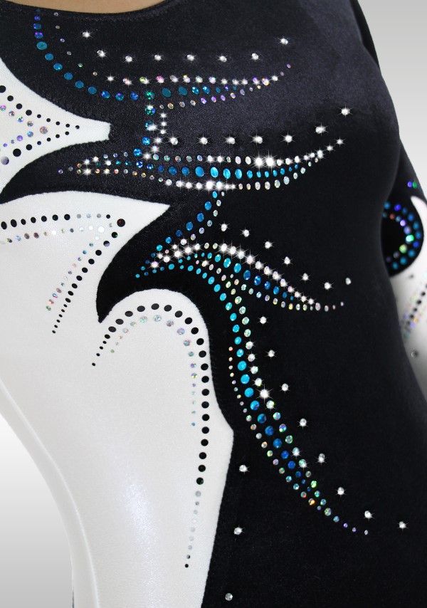 Leotard in white wetlook combined with black velvet. A beautiful pattern of turquoise and silver sequins adorns the front and the back.